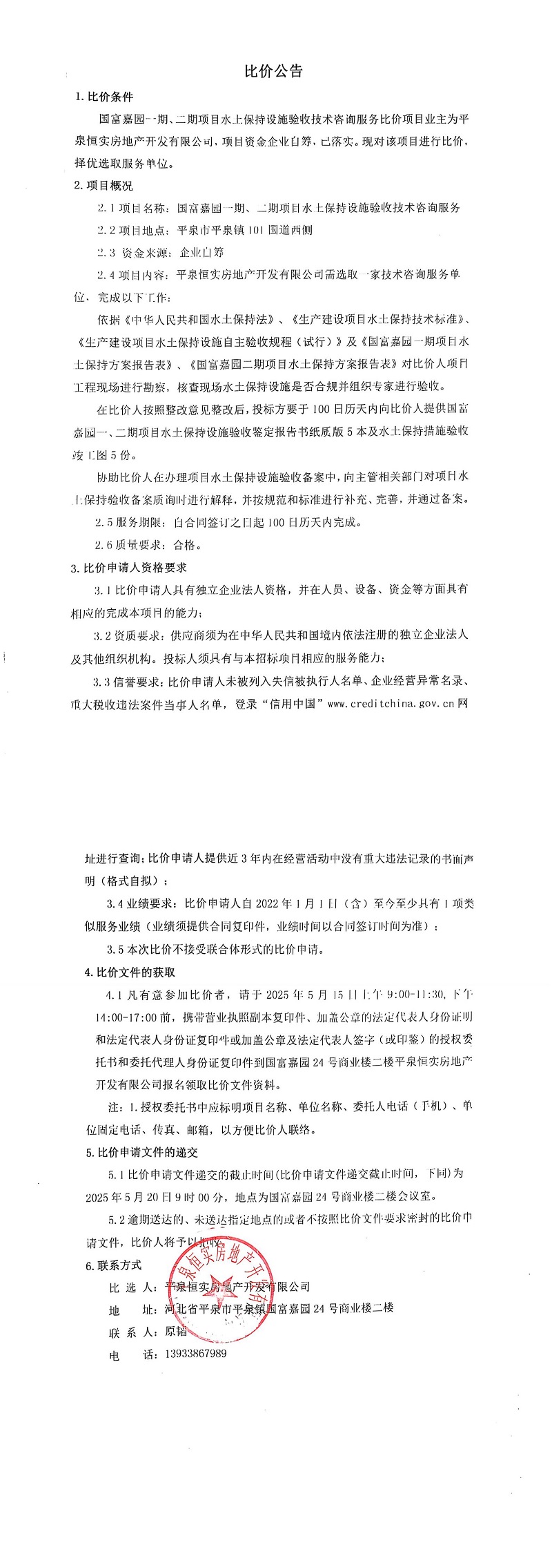 平泉國富嘉園一期、二期項(xiàng)目水土保持設(shè)施驗(yàn)收技術(shù)咨詢服務(wù)比價(jià)公告