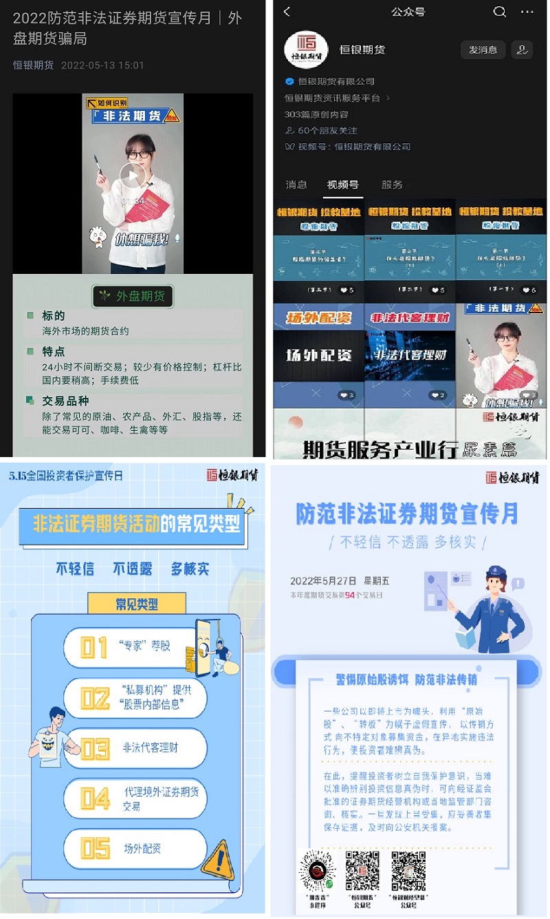 線下活動(dòng)進(jìn)行的同時(shí),恒銀期貨公眾號(hào)、視頻號(hào)也在推進(jìn)反詐防非的內(nèi)容宣傳,通過圖文講解、短視頻、宣傳海報(bào)等多種方式傳播知識(shí),增強(qiáng)投資者反詐意識(shí)。