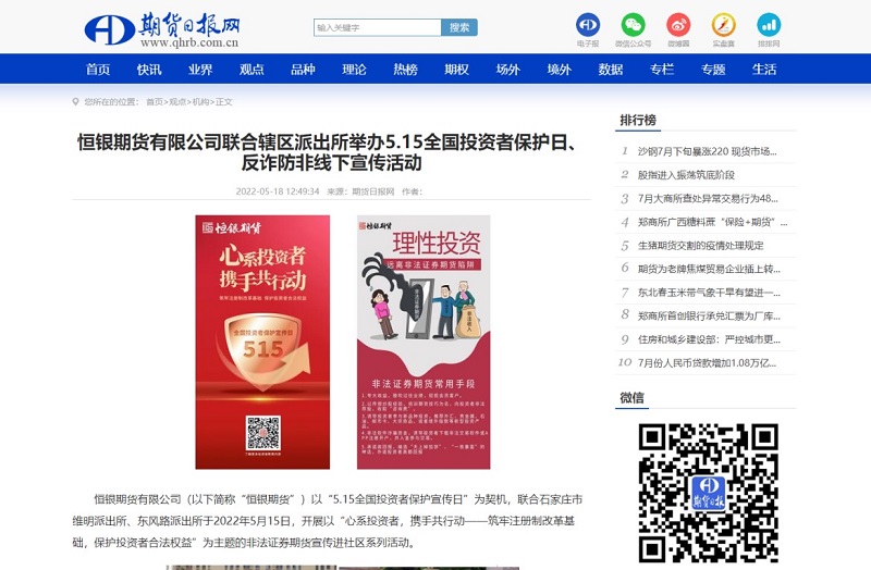 2022年5月為第三屆全國防范非法證券期貨宣傳月,本屆防非宣傳月的主題為“選擇合法機(jī)構(gòu),遠(yuǎn)離非法主體,堅(jiān)持理性投資,謹(jǐn)防上當(dāng)受騙”。為進(jìn)一步加大防范非法證券期貨宣傳力度,提示非法證券期貨活動(dòng)風(fēng)險(xiǎn),增強(qiáng)人民群眾對(duì)非法證券期貨活動(dòng)的防范意識(shí)和能力,恒銀期貨有限公司(以下簡(jiǎn)稱“恒銀期貨”)在河北證監(jiān)局、河北省證券期貨業(yè)協(xié)會(huì)的指導(dǎo)下,組織了“五個(gè)走進(jìn)”系列活動(dòng),走進(jìn)了校園、社區(qū)、企業(yè)進(jìn)行了系列反詐防非活動(dòng),并以此為契機(jī)宣傳期貨相關(guān)知識(shí),發(fā)揮期貨公司服務(wù)實(shí)體經(jīng)濟(jì)發(fā)展的專業(yè)價(jià)值。