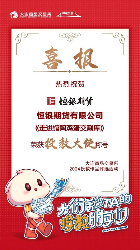 近日,由大連商品交易所舉辦的“大衍和TA的投教朋友們”——2024年大商所投教作品評(píng)選活動(dòng)圓滿落幕。經(jīng)過(guò)激烈的角逐和嚴(yán)格的評(píng)審,國(guó)富公司所屬恒銀期貨有限公司(以下簡(jiǎn)稱恒銀期貨)憑借《走進(jìn)館陶雞蛋交割庫(kù)》的投教視頻作品,成功榮獲“投教大使”稱號(hào)。