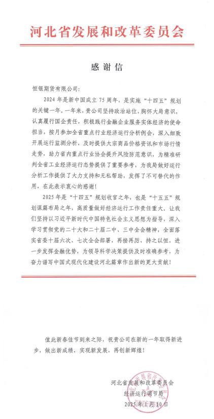 近日,河北省發(fā)展和改革委員會(huì)經(jīng)濟(jì)運(yùn)行調(diào)節(jié)局向恒銀期貨發(fā)來感謝信。信中對恒銀期貨踐行國有金融企業(yè)服務(wù)實(shí)體經(jīng)濟(jì)的使命擔(dān)當(dāng)、深入細(xì)致開展運(yùn)行監(jiān)測分析、及時(shí)提供大宗商品價(jià)格資訊和市場行情走勢、助力省內(nèi)重點(diǎn)行業(yè)協(xié)會(huì)提升風(fēng)險(xiǎn)防范意識、協(xié)助研判全省工業(yè)經(jīng)濟(jì)運(yùn)行態(tài)勢等工作表示感謝,并對恒銀期貨2025年工作提出了期望和要求。